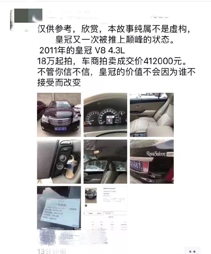 然而更精彩的还在后头,这台车最终拍卖成交价竟然高达41.2万!真实有钱人才买二手车啊!这对于许多人来说似乎都是不可理解的,毕竟皇冠即便是在国内最巅峰的时候,也只是跟BBA的E级、5系、A6掰掰手腕,在后期遇冷的时候甚至只能放下身段与A4、三系竞争,但是这台9年车龄的老皇冠居然卖出了新款5系的新车价格,这究竟是怎么一回事?