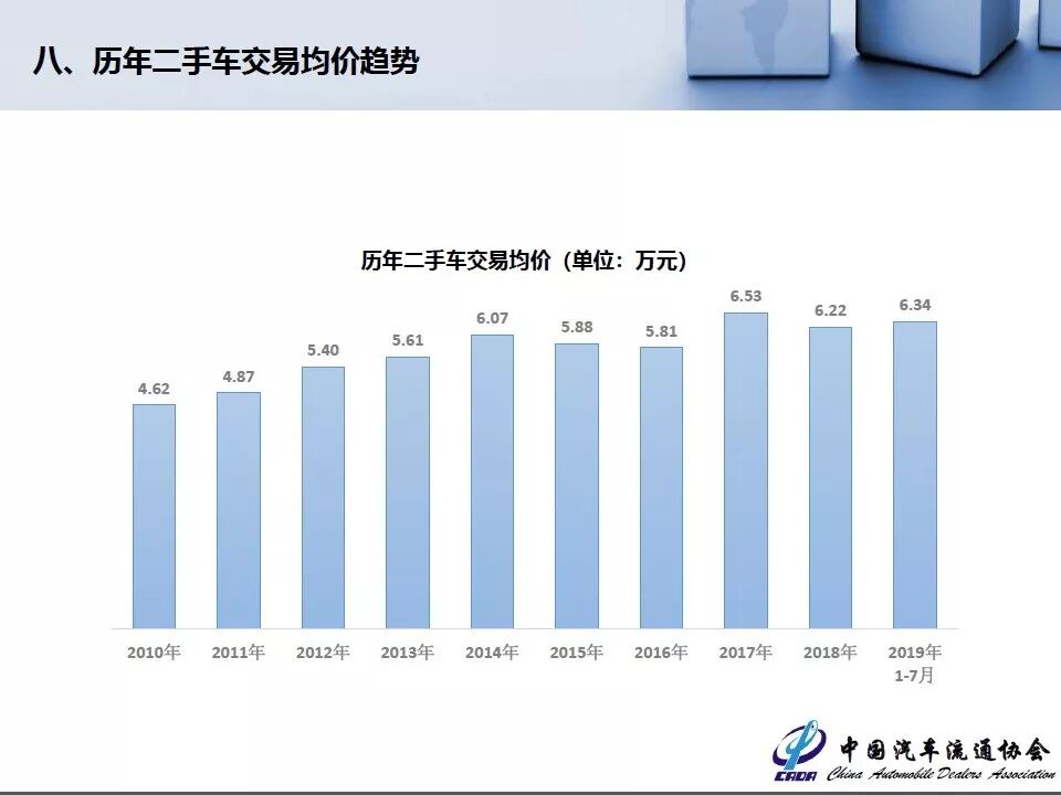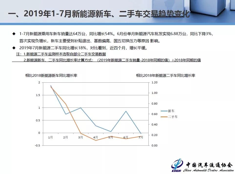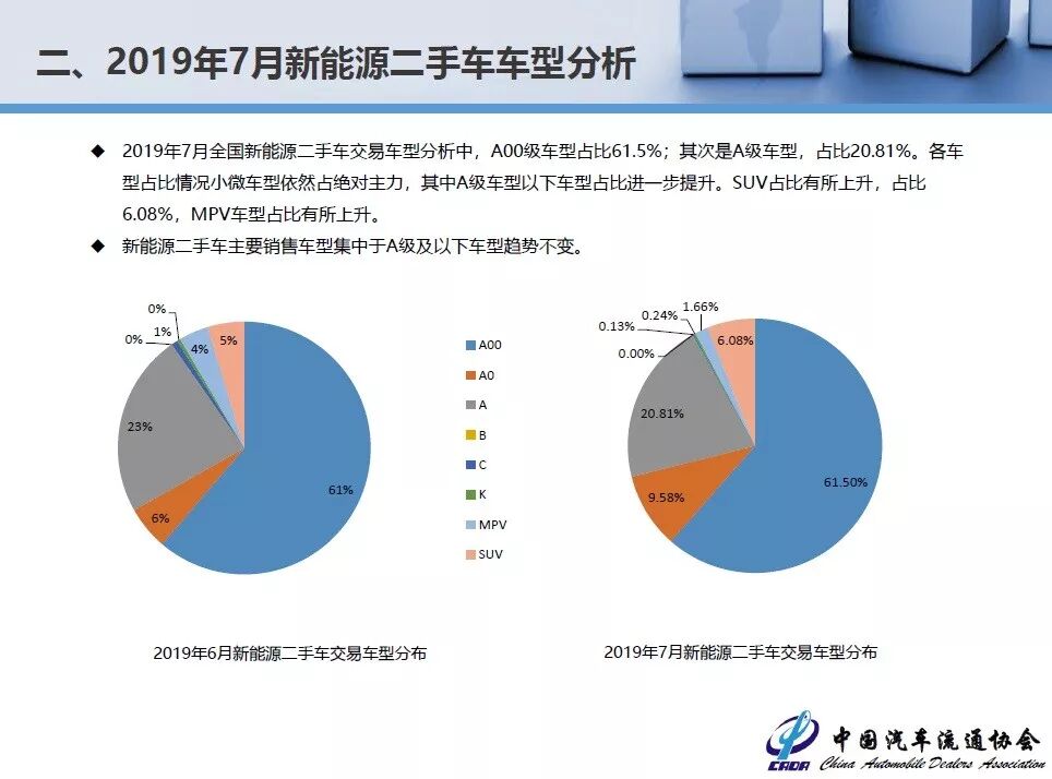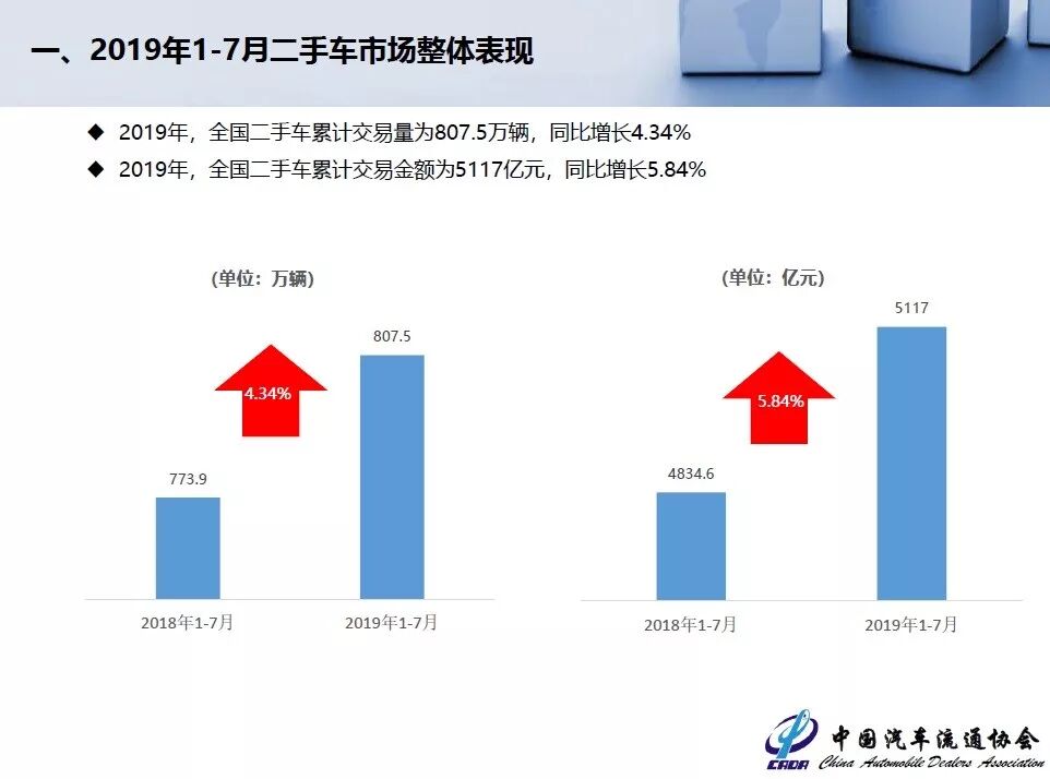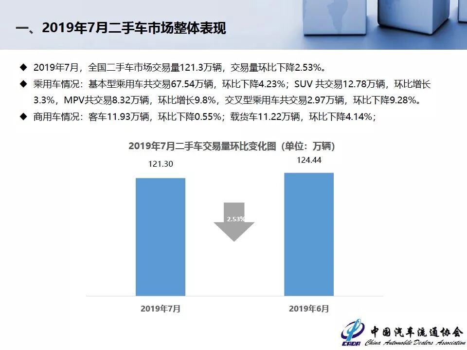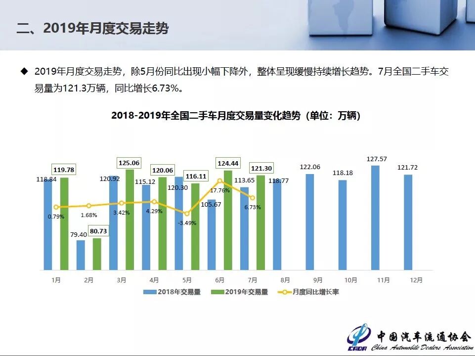 2019年7月全国二手车市场交易量121.3万辆,交易环比下降2.53%,同比增长6.73%。