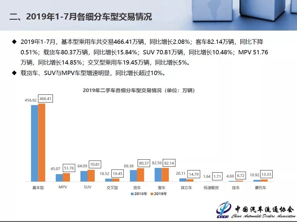 乘用车情况:基本型乘用车共交易67.54万辆,环比下降4.23;SUV共交易12.78万辆,环比增长3.3%,MPV共交易8.32万辆,环比增长9.8%;交叉型乘用车共交易2.97万辆,环比下降9.28%。