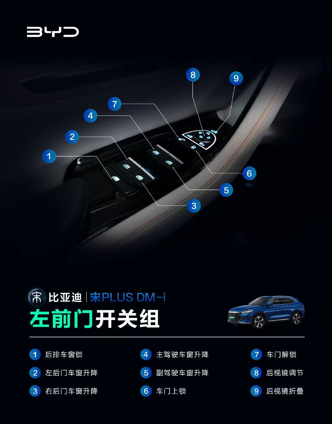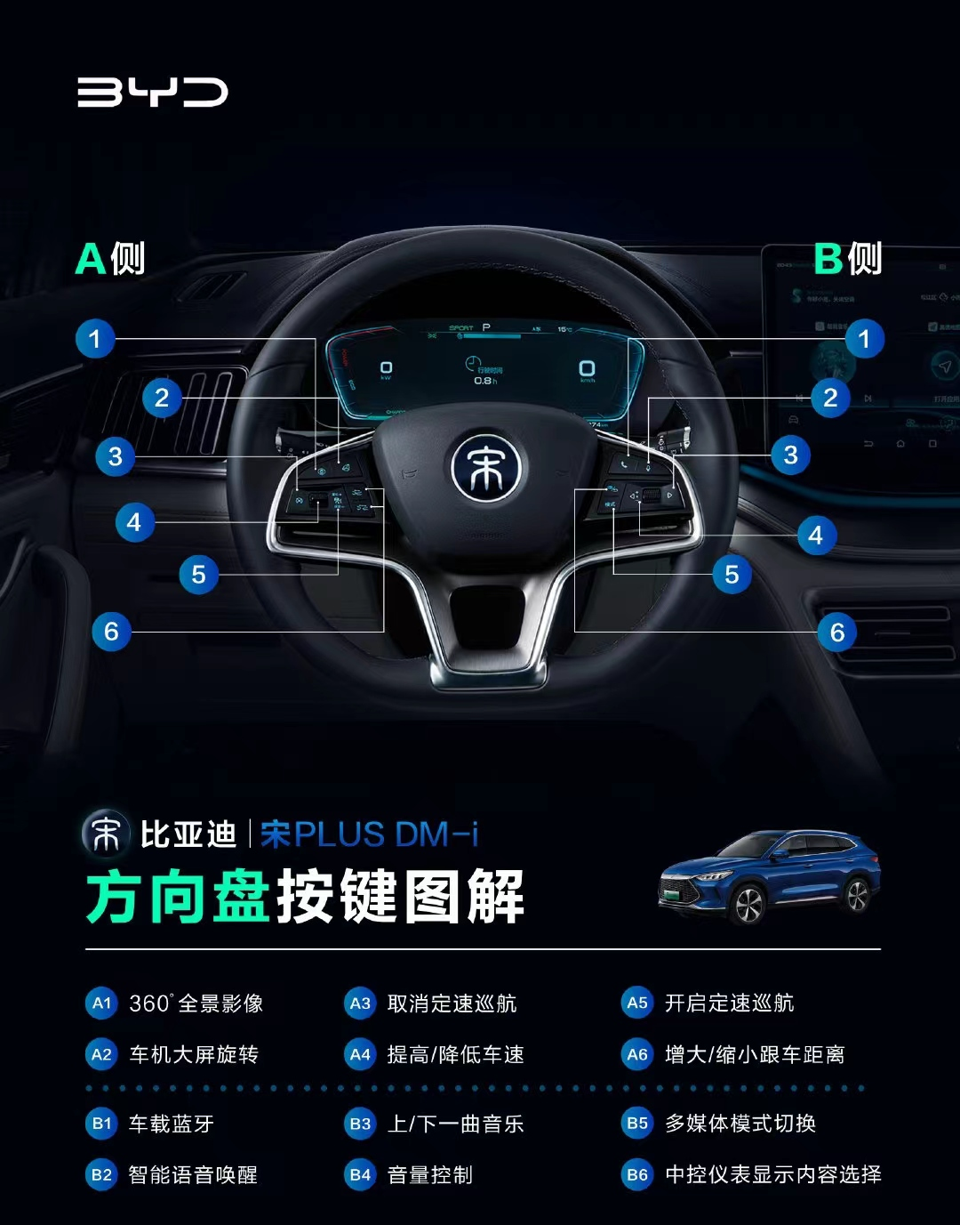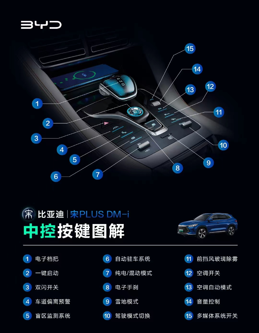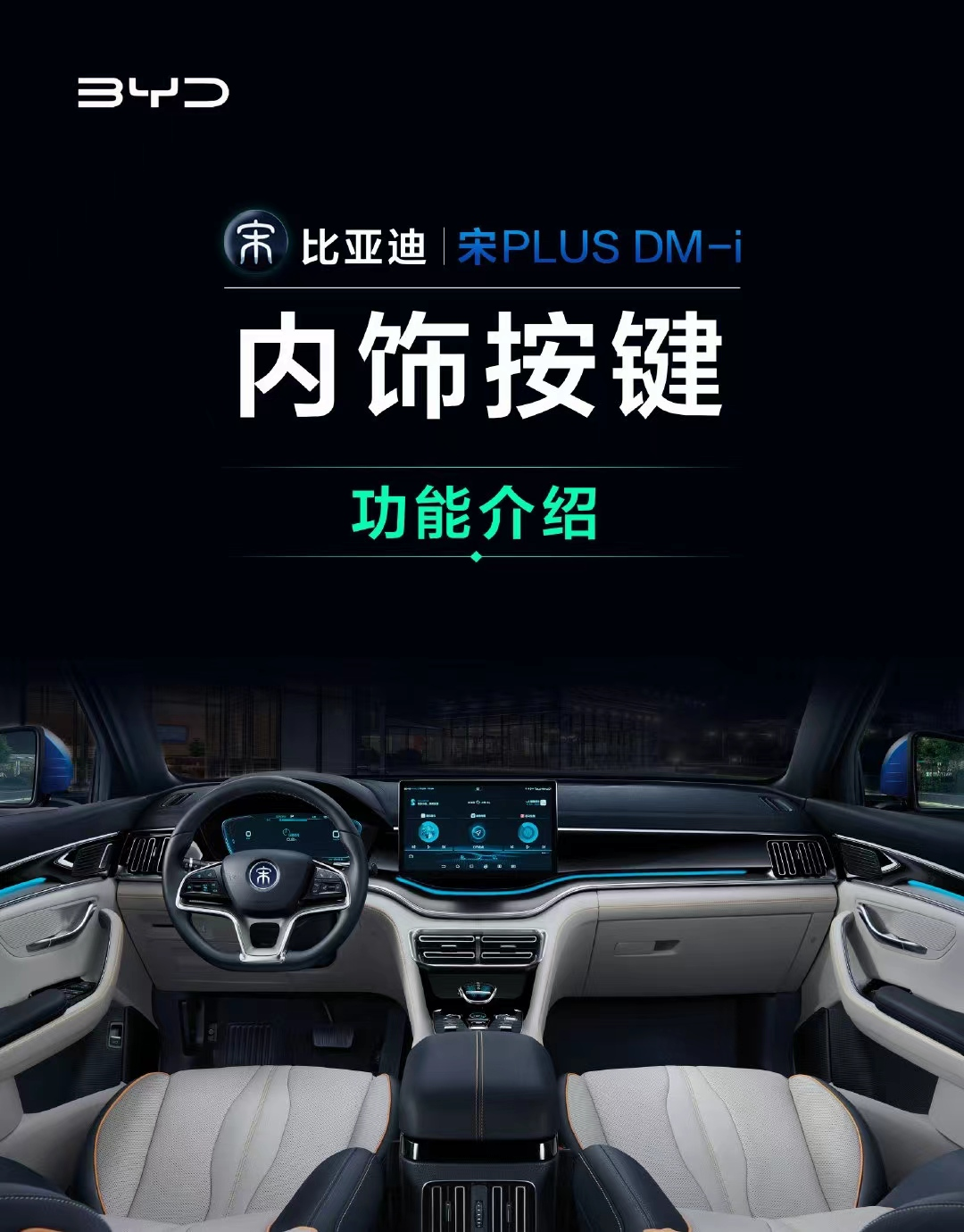 近日,比亚迪官方发布了宋PLUS DM-i内饰按键功能介绍,详细的描述了各按键的功能,请车友们收藏并转发!