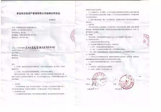 但相比其他两家平台,投资人提供了诺筹网与4家汽车经销商的战略合作协议,签订时间都在2016年10月至11月。4家分别为青岛鼎鑫俊翔汽车销售有限公司、青岛明行海通汽车贸易有限公司、李沧区三毛福源车行、青岛乾信达汽车服务有限公司,除三毛福源车行外,其他均成立于2016年。