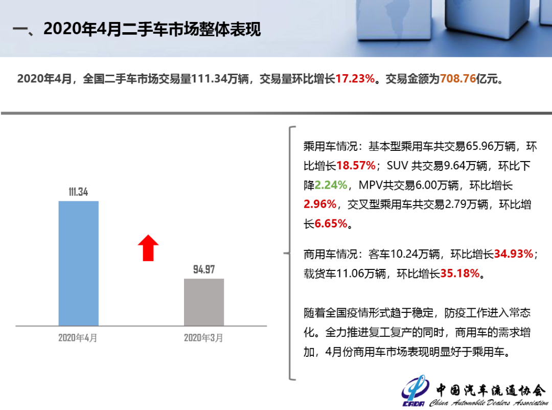 导读:2020年4月,全国二手车市场交易量111.34万辆,交易量环比增长17.23%。交易金额为708.76亿元。乘用车情况:基本型乘用车共交易65.96万辆,环比增长18.57%;SUV共交易9.64万辆,环比下降2.24%,MPV共交易6.00万辆,环比增长2.96%,交叉型乘用车共交易2.79万辆,环比增长6.65%。