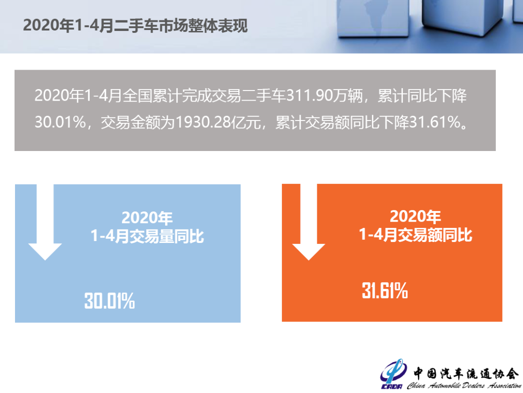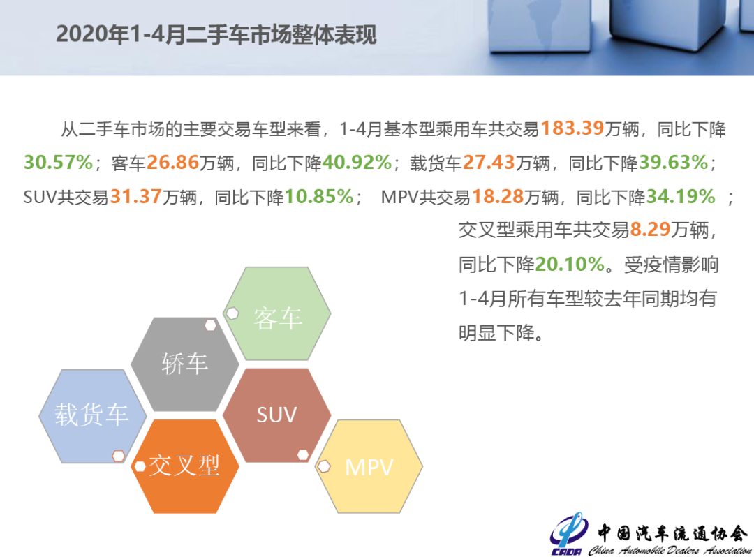 从二手车市场的主要交易车型来看,1-4月基本型乘用车共交易183.39万辆,同比下降30.57%;客车26.86万辆,同比下降40.92%;载货车27.43万辆,同比下降39.63%;SUV共交易31.37万辆,同比下降10.85%。