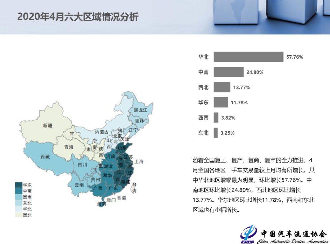 4月全国各地区二手车交易量较上月均有所增长。其中华北地区增幅最为明显,环比增长57.76%。中南地区环比增长24.80%,西北地区环比增长13.77%。华东地区环比增长11.78%,西南和东北区域也有小幅增长。