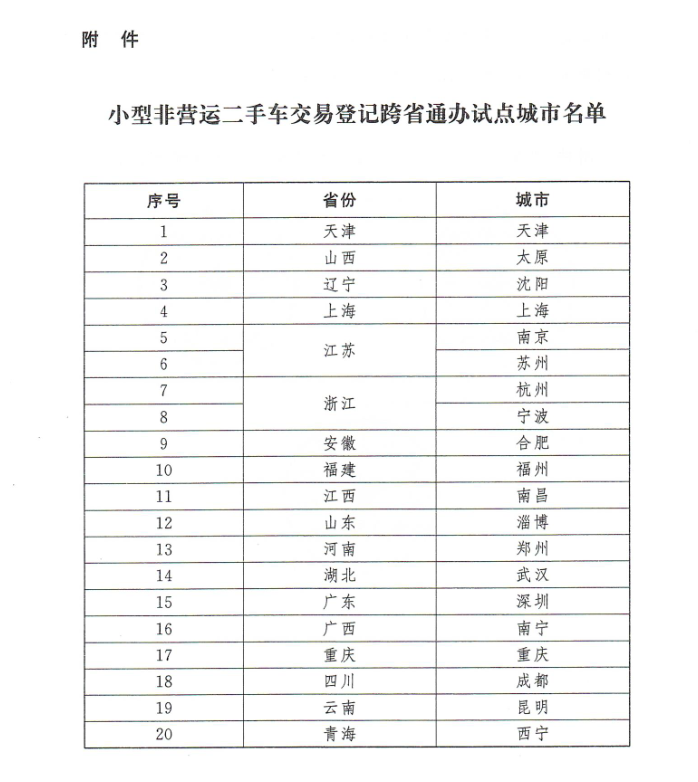 此外,《通知》对政策落地实施进度做了具体部署,明确2021年6月1日起,在天津、太原、沈阳、上海等20个城市(名单见附件)试点推行小型非营运二手车异地交易登记;自2021年9月1日起,直辖市、省会市、自治区首府市、计划单列市全部推行;2022年全国全面推行。