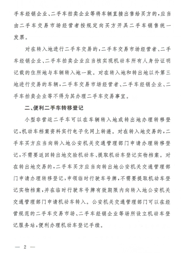 一是推行二手车异地交易。当前我国二手车市场日益活跃,二手车交易持续增长,群众异地购车需求明显增多。为便利二手车异地交易,《通知》提出,对已登记的小微型非营运载客汽车(以下简称小型非营运二手车),买卖双方可以选择在车辆转出地或者转入地进行交易。办理交易的二手车交易市场经营者、二手车经销企业、二手车拍卖企业等经营主体应当依规核验车辆及手续资料、开具二手车销售统一发票。对在车辆转入地和转出地以外第三地进行交易的车辆,不得为其办理交易事宜。通过明确异地交易和发票开具要求,实现“马上办”“就地办”,切实保障在转入地办理交易手续的政策落地落实。