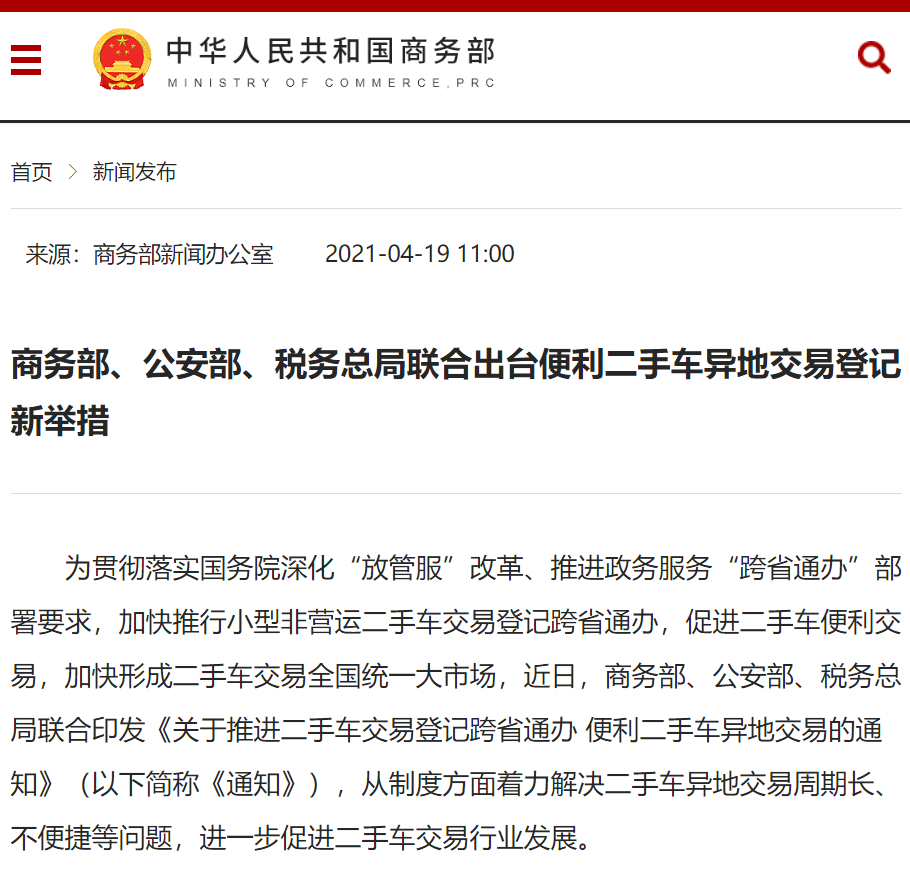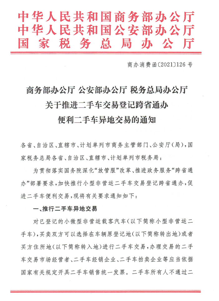 为贯彻落实国务院深化“放管服”改革、推进政务服务“跨省通办”部署要求,加快推行小型非营运二手车交易登记跨省通办,促进二手车便利交易,加快形成二手车交易全国统一大市场,近日,商务部、公安部、税务总局联合印发《关于推进二手车交易登记跨省通办 便利二手车异地交易的通知》(以下简称《通知》),从制度方面着力解决二手车异地交易周期长、不便捷等问题,进一步促进二手车交易行业发展。