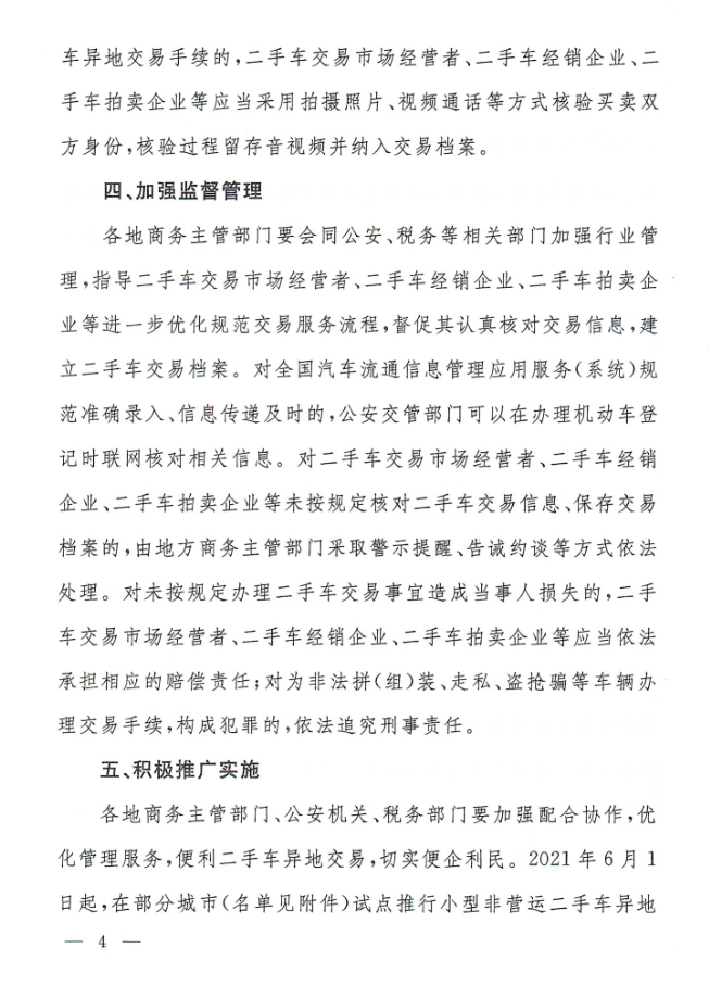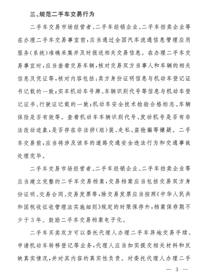 三是规范二手车交易行为。《通知》进一步强化了经营主体责任,确保交易安全,维护交易各方合法权益。要求二手车经营主体在办理二手车交易事宜前,应当通过全国汽车流通信息管理应用服务(系统)准确采集并及时报送相关交易信息,核对二手车交易双方当事人和交易车辆的相关信息及凭证,建立完整的二手车交易档案,并按照规定的时限保存。对二手车买卖双方委托代理人办理二手车异地交易手续提出了细化要求。