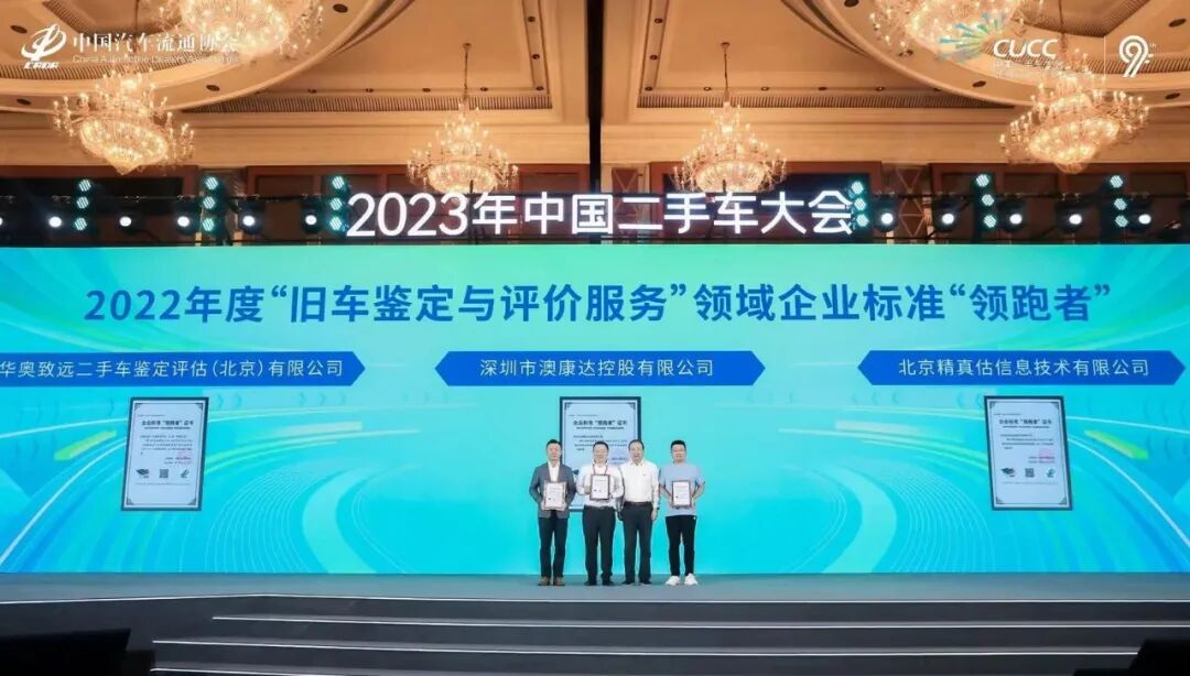 为贯彻落实《国家标准化发展纲要》,在2022 年国家市场监督管理总局发布的240个重点领域中,中国汽车流通协会连续第二年作为“旧车鉴定与评价服务”重点领域的评估机构,承担该领域的企业标准“领跑者”评估工作。经过企业标准检索、综合比对评估、企业确认验证、社会公开公示等程序,最终有3家企业的企业标准达到了行业领跑水平,体现出了二手车行业鉴定评估专业技术特征以及鉴定评估人员的专业技术能力。中国汽车流通协会会长沈进军为2022年度“旧车鉴定与评价服务”领域企业标准“领跑者”代表——深圳市澳康达控股有限公司总经理陈祥达、华奥安心技术服务(集团)股份有限公司副董事长许可飞、北京精真估信息技术有限公司CEO周广印,颁发企业标准“领跑者”证书。